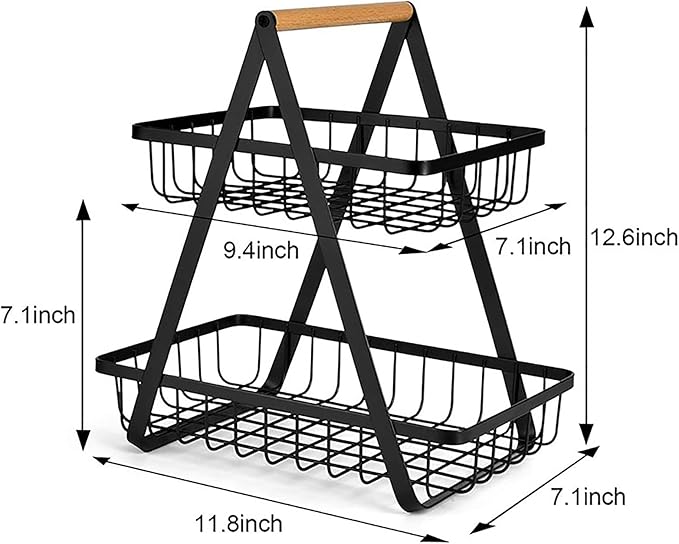 سلة فواكهة بدورين، منظم لرف المطبخ والسفرة، قابل للفصل، حامل لتخزين الخضروات والفاكهة (اللون: اسود)، معدن
