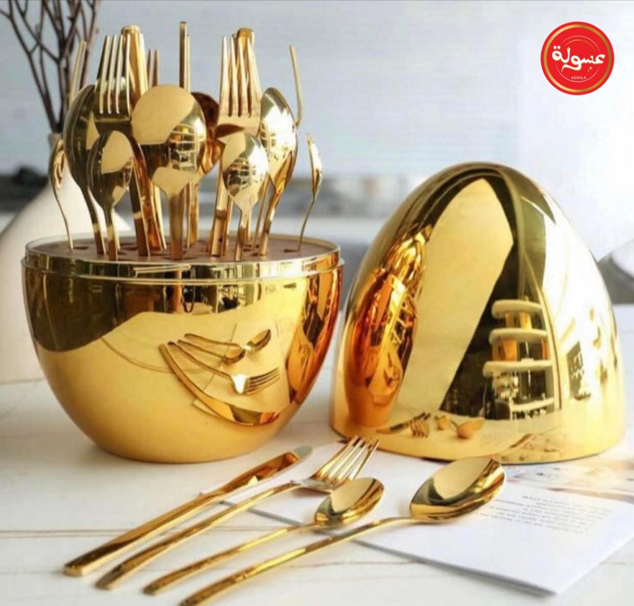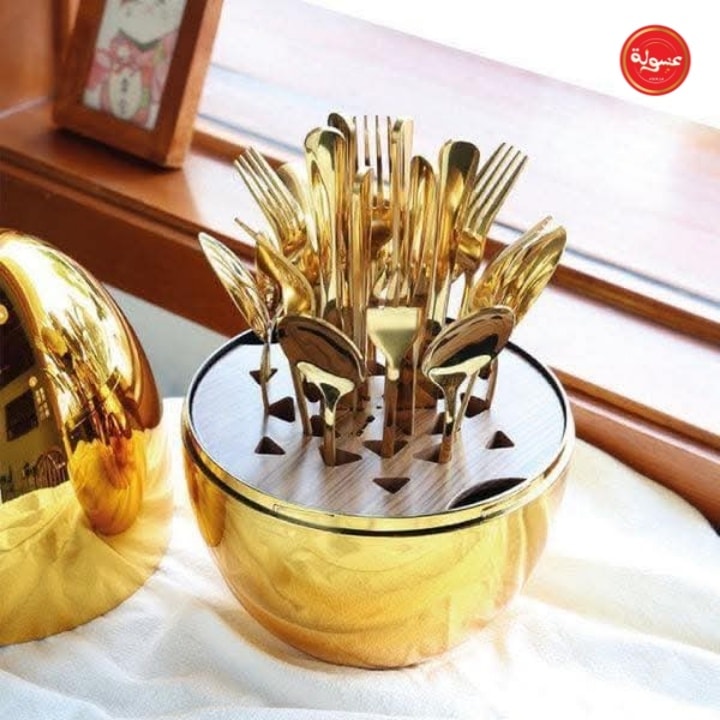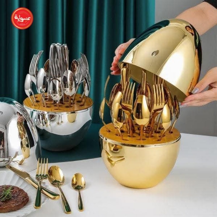 مجموعة من الملاعق والسكاكين والشوك وملاعق الشاي داخل بيضة ذهبية. قمة الروعة وجمال الديكور في المطبخ العصري. تتكون من ٢٤ قطعة من الملاعق والسكاكين والشوك.