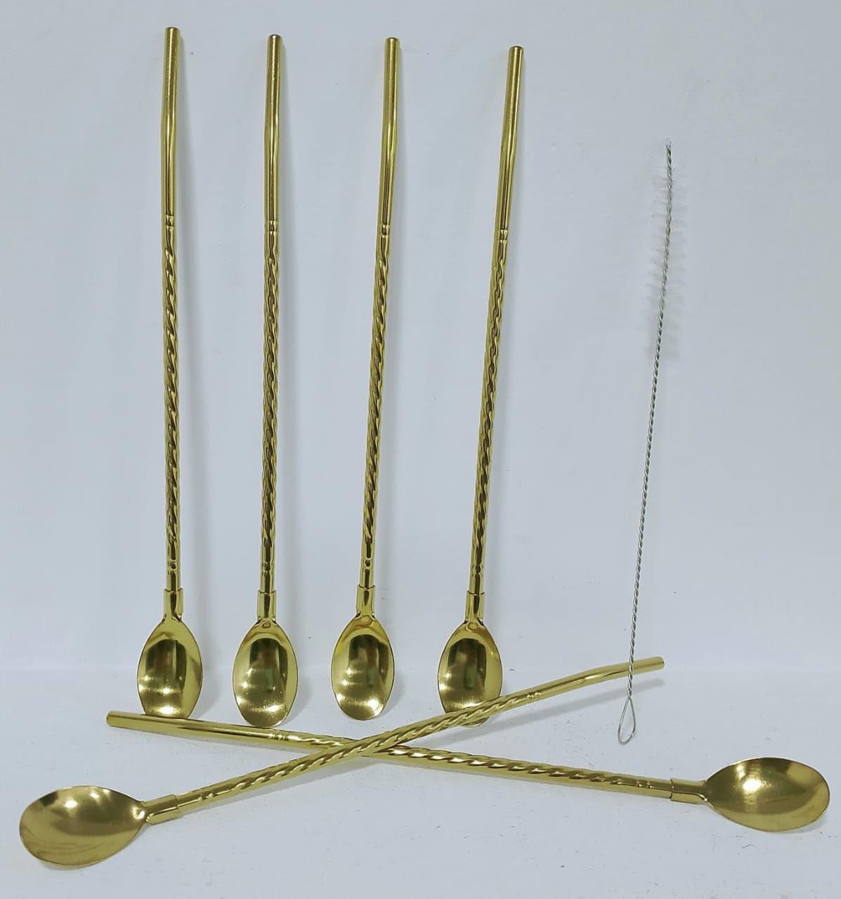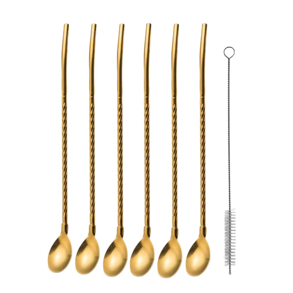 طقم ملاعق ذهبية من الفولاذ المقاوم للصدأ مع فرشاة تنظيف، 6 ملاعق طويلة ملفوفة، تصميم شفاطة قابلة لإعادة الاستخدام