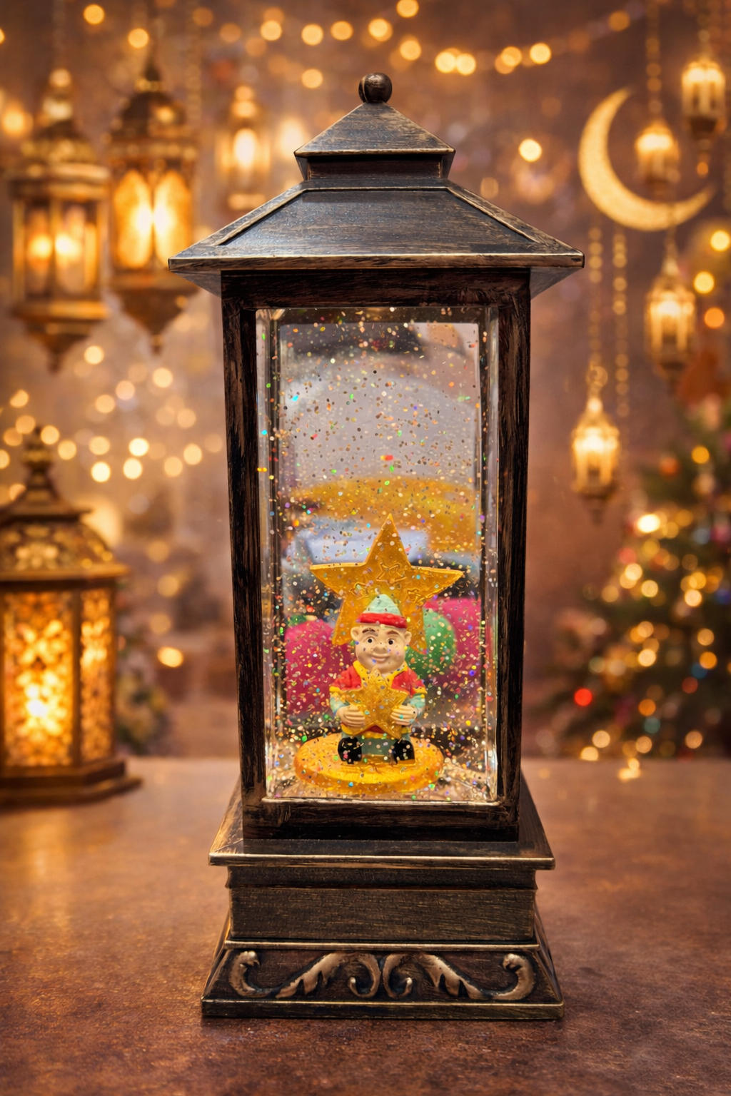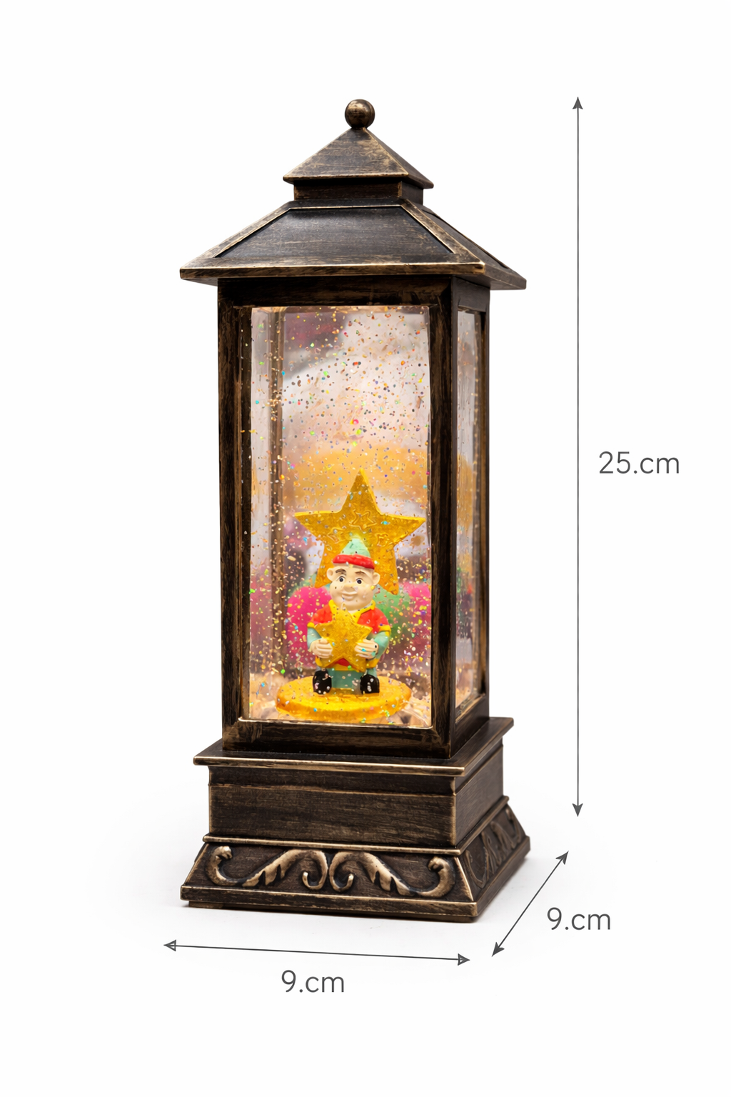 يحتوي الفانوس على شخصية زخرفية داخلية، ومملوء بالماء واللمعان لإعطاء تأثير كرة الثلج المتحركة عند التشغيل، مما يجعله قطعة لافتة للنظر ومناسبة للديكور والهدايا.